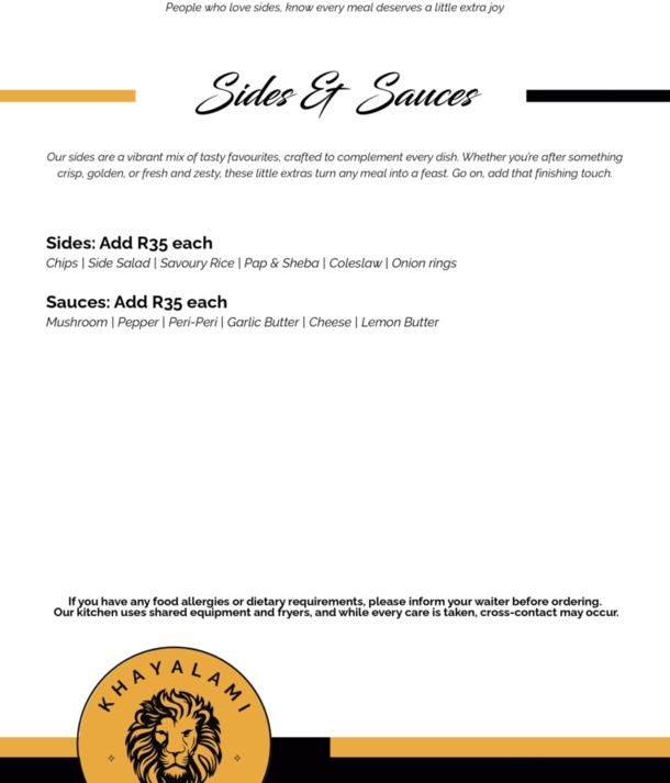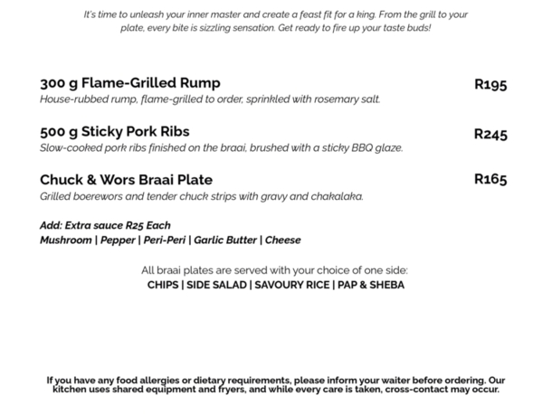 Enjoy authentic South African flavors with expertly grilled cuts, tender braai favorites, and hearty sides. Perfectly prepared over an open flame for a bold, comforting taste in every bite.