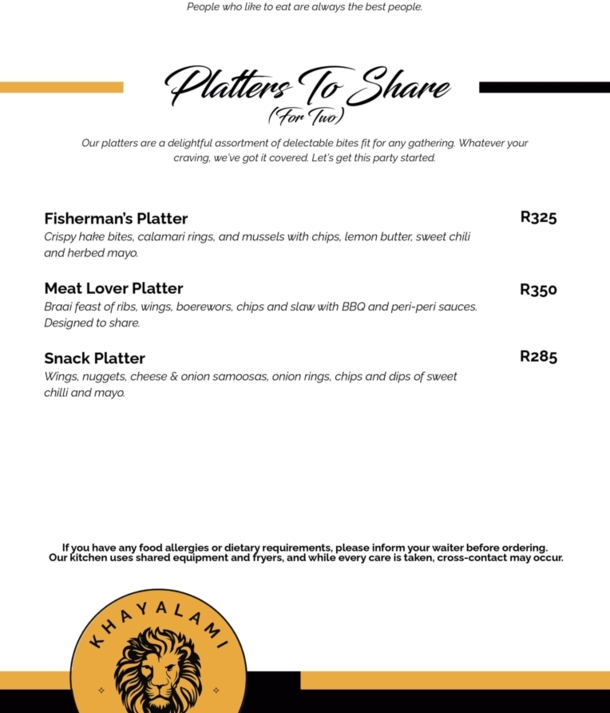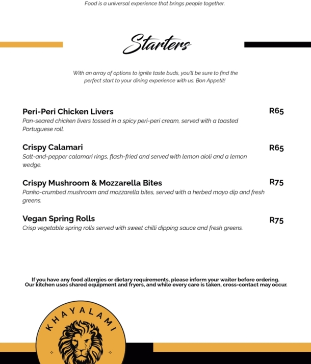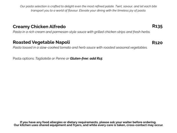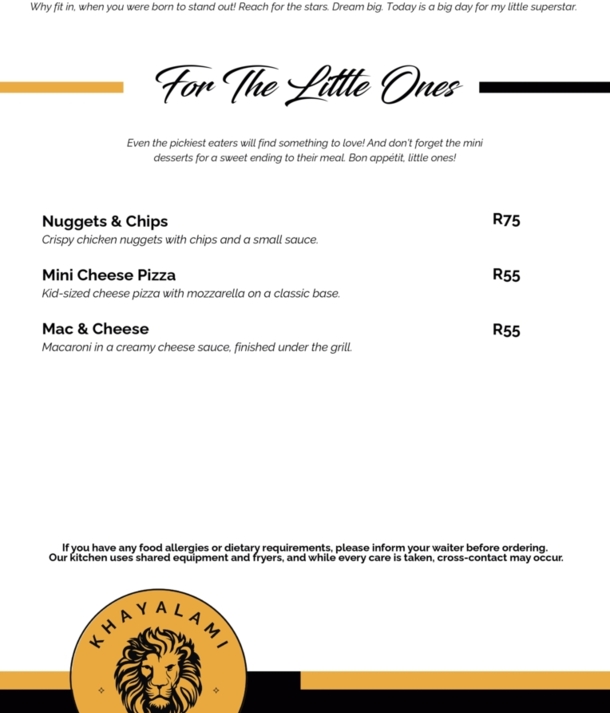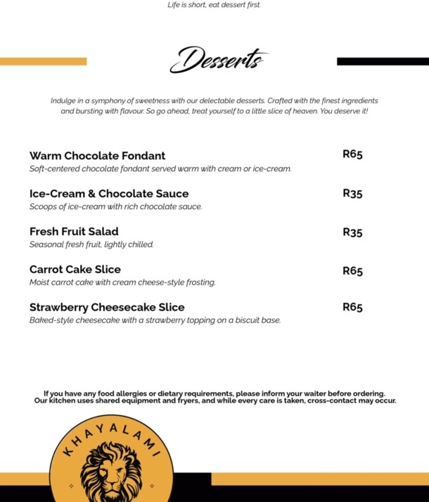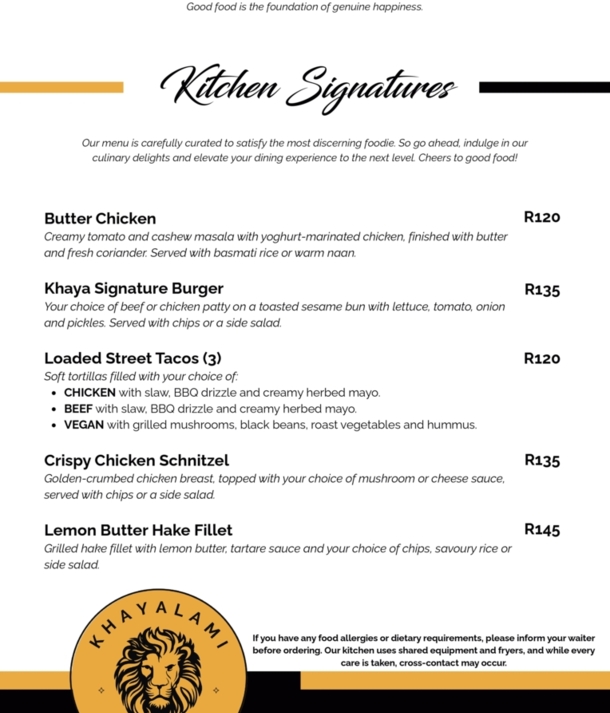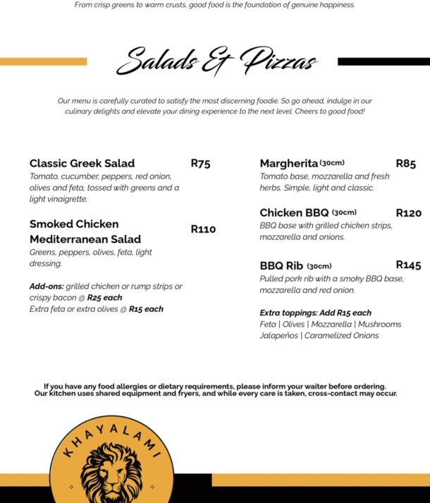Our menu offers a refined selection of signature dishes, braai favorites, pastas, pizzas, salads, and sweet treats—all prepared with fresh ingredients and the warm service Khayalami is known for.